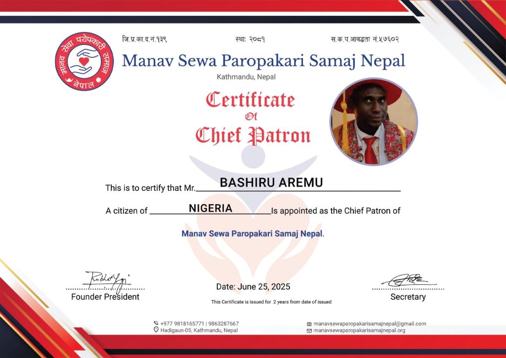 The appointment letter to UNESCO Laureate, Prof Sir Bashiru Aremu appointing him as Chief Patron , “Manav Sewa Paropakari Samaj Nepal” as signed by the group’s Founder/President, Prabhat Nath Yogi reads in parts: “Warmest congratulations on your appointment as Chief Patron ”Manav Sewa Paropakari Samaj Nepal”. On behalf of Manav Sewa Paropkari Samaj Nepal, we extend our warmest welcome as you join us as our Chief of Patron”.